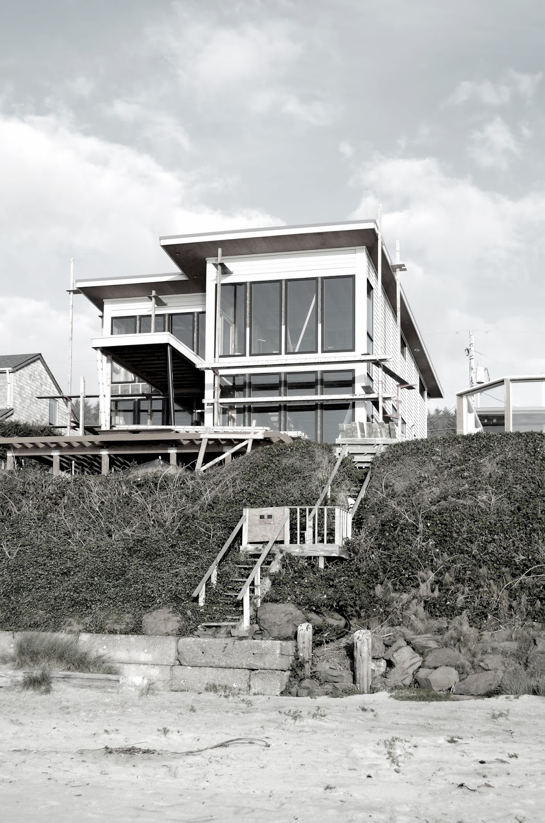 This week’s Construction B&W features the Roads End project in Lincoln City. Construction continues to move along smoothly at this oceanfront property thanks to Don Young and Associates, the General Contractor. The simple two story shed roof design has taken shape and is now weather tight in preparation for the interior finish work.